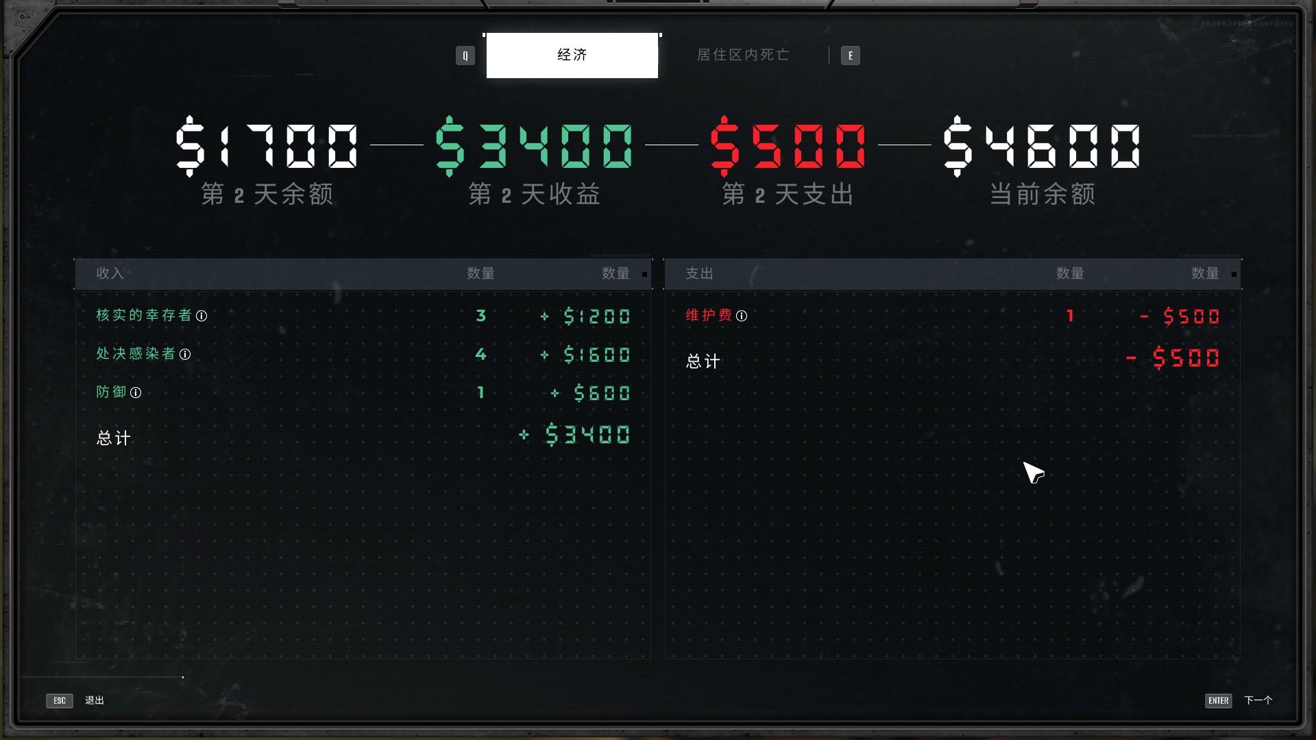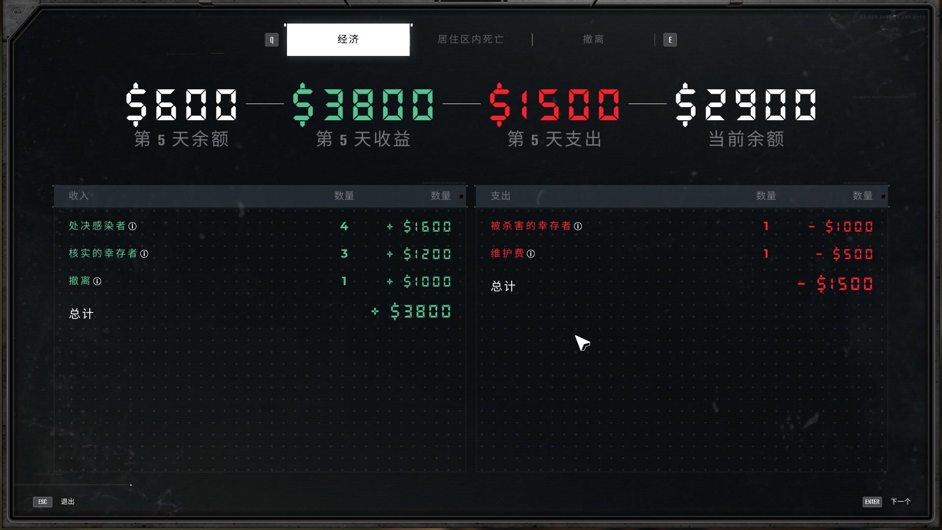 每完成检测,包括没收违禁品、或是处决感染者、完成任务板上的任务等都可以获得金钱奖励,但是相应的如果把健康人杀了,错误的没收了物品或是让违禁品被带入居住区,则会遭到罚款,放感染者进居住区导致死亡也会罚款。另外,营地每天运行消耗的食物、医疗包、发电燃料等也需要玩家来花钱补充,后期升级建筑需要的金钱也很多,有的高达上万,资金方面的压力还是不小的。而完成检测、切片感染者等还可以获得科技点数,使用科技点数可以升级基地,目前可以从1级升到5级,每升一级还能升级检测内容,包括提供额外预警信息、扩大范围等,但是科技树整体来说比较简单。另外就是基地升级之后可以对营地里的各项设施进行升级改造,比如提高各区域容纳的人口上限、资源上限等。而到了结算的时候,玩家可以分配幸存者,去军队的可以获得金钱奖励,去研究院的可以获得科技点数,可根据自己需要来安排。