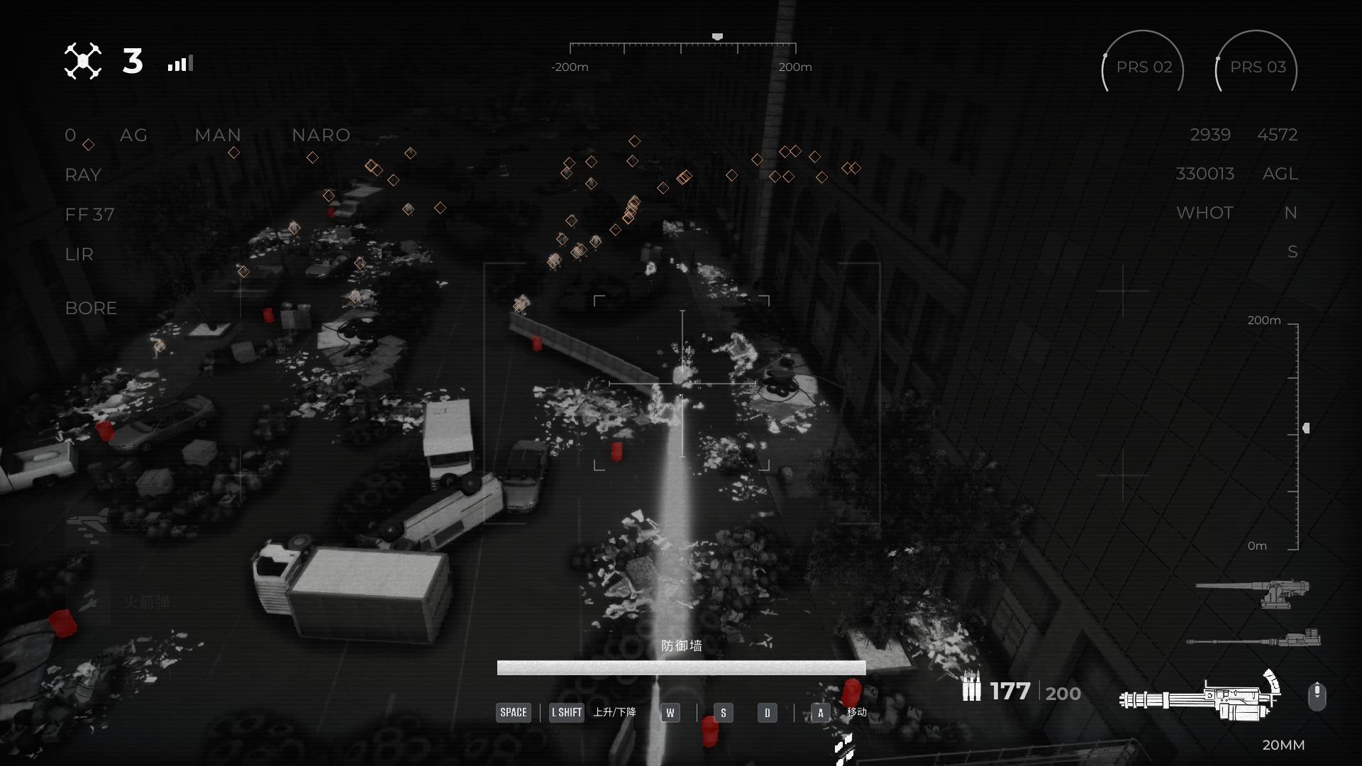 游戏最解压的还是无人机打丧尸了,玩家操控的无人机有3种武器,打光子弹切换别的武器可以节省装弹时间,既可以使用武器精准击杀,也可以使用威力巨大的爆炸武器造成成片杀伤,还能打爆场景里的油桶等造成环境伤害,爽感很足。