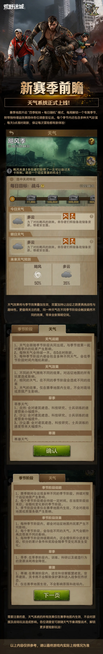 赛季地图开启“四季轮转+每日随机”模式,每周解锁一个专属季节,附带独特增益效果陪伴各位调查官征战。每个季节内还包含多种天气彩蛋每天0点准时刷新,保证每次冒险都有新体验!具体参考如下图例介绍: