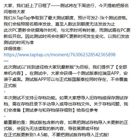 目前我们正在处理相关工作,如果这个计划可行的话,我们会在本周五(1月23日),在官方群内开放测试申请链接,到时候大家直接通过官方群内的问卷申请即可。在测试准备好后,会通过TapTap站内信给大家发放。