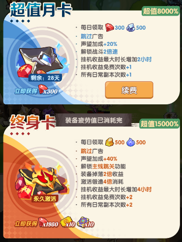 月卡挂机收益时长增加2小时,终身卡挂机收益时长增加4小时,声望战令的声望加成从20%提升至30%;