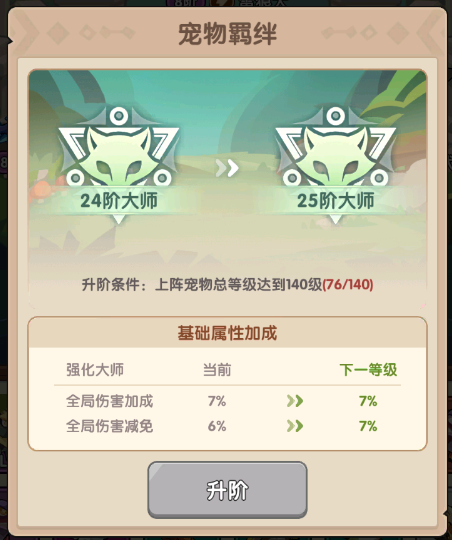 ①新增「连携技能」上阵 4 只同阵营的非通用宠物就能激活连携技能,如果上阵里有通用宠物,它的阵营会自动转化为上阵中数量最多的那个阵营,宠物总阶数越高技能等级越高!