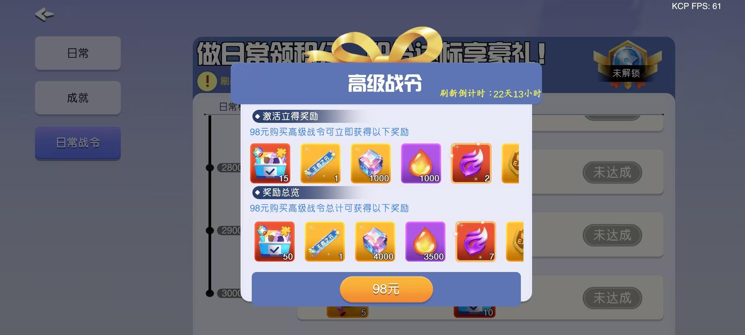 然后,除了永久月卡以外,节日活动的98战令是最值得氪的。可以稳定获得一个红道具+20皮肤碎片+几千钻石+部分实用道具(后续活动能不能拿到,不保证哈)。普通中氪玩家玩这个游戏,推荐永久月卡+上面这个活动战令,其它什么花里胡哨特权高级战令奇怪的补给,统统不用氪(第一个月的月卡和寻芳特权除外)。所以为啥会有V5V6玩家按着V8V9打,因为除了永久卡和活动98战令,目前氪金系统几乎全是坑。然后这个节日活动,也有进步空间,可以考虑在6元到30元价格区间段给到橙色道具,满足微小氪玩家日常需求,同时也能增加部分月流水。