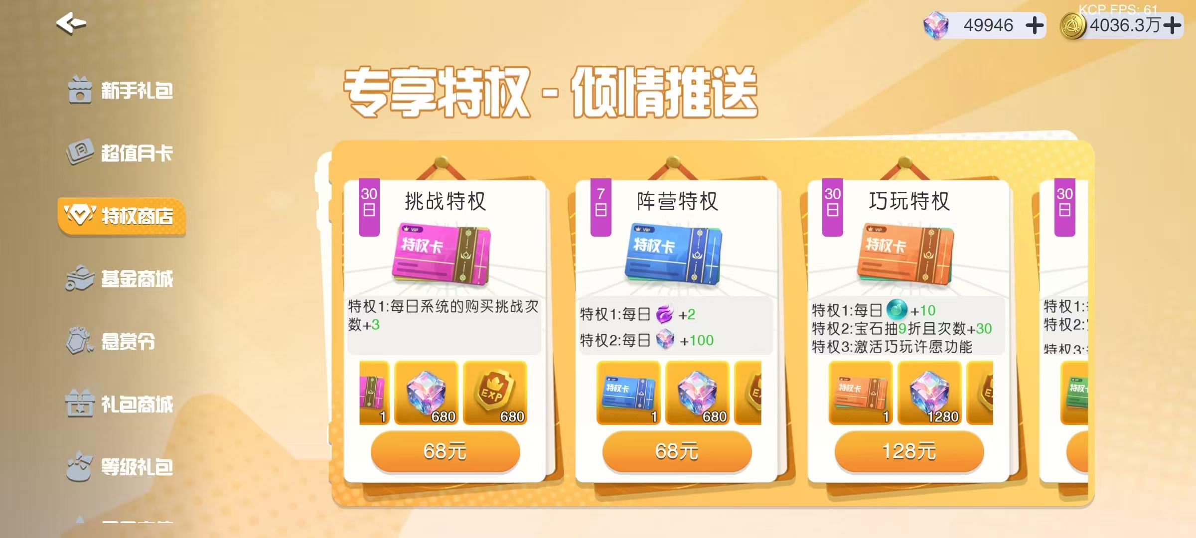 这个挑战特权氪佬专属,因为只有氪佬才不缺钻石。多三次钻石挑战次数,这个氪金收益就很迷。普通玩家钻石本来就很缺,还要每天额外花450钻石买资源,如果是三次免费次数的话,部分缺资源的玩家倒是可以考虑入手。阵营特权,等于68元买14个阵营招募令。游戏前两周冲榜的时候,氪佬可以考虑买,后期收益率偏低。如果是改成30天特权,每天发一个阵营令,可能销量会涨一些,毕竟一个月多30抽,也多不出来一个完整的光暗战灵。阵营令这东西,开两个小号,两天可以多拿一个,开四个小号,一天一个,关键是免费。玩巧特权咋说呢,相当于一个月额外多10个红玩巧碎片+20个橙玩巧碎片。玩巧正常游戏内产出是每月差不多25个红碎片+50个橙碎片。这个仁者见仁,智者见智。