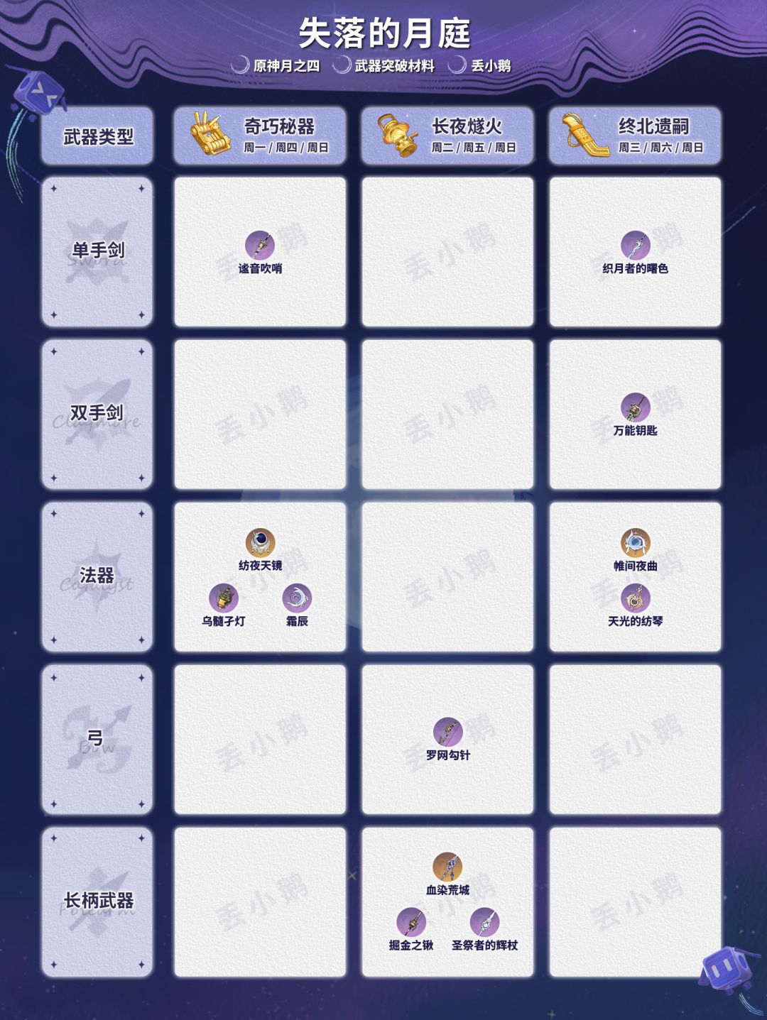● 4星武器:「单手剑·西福斯的月光」、「双手剑·西风大剑」、「长柄武器·匣里灭辰」、「法器·昭心」、「弓·西风猎弓」