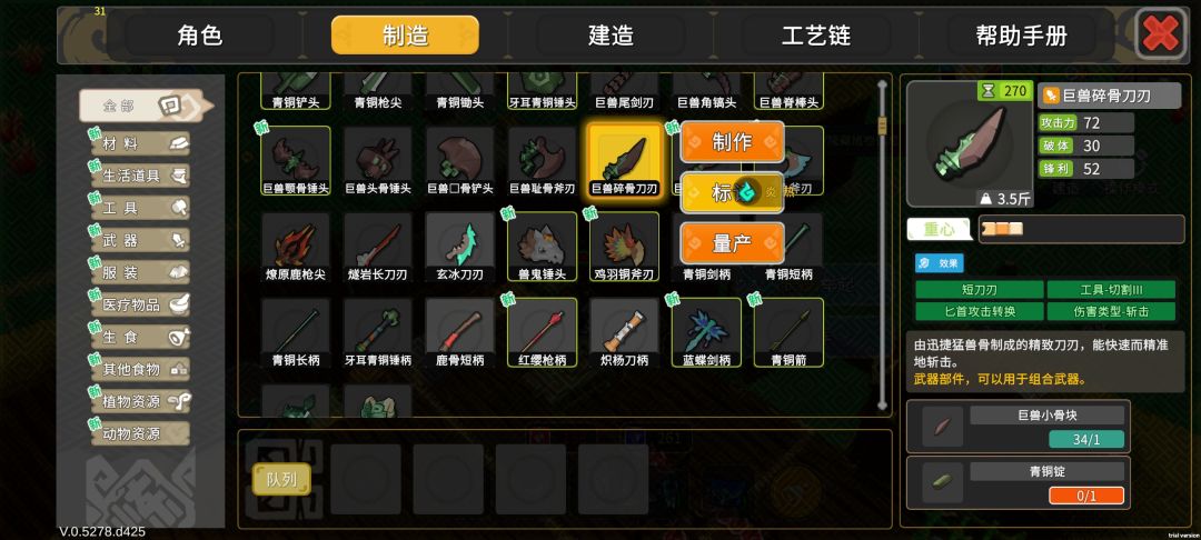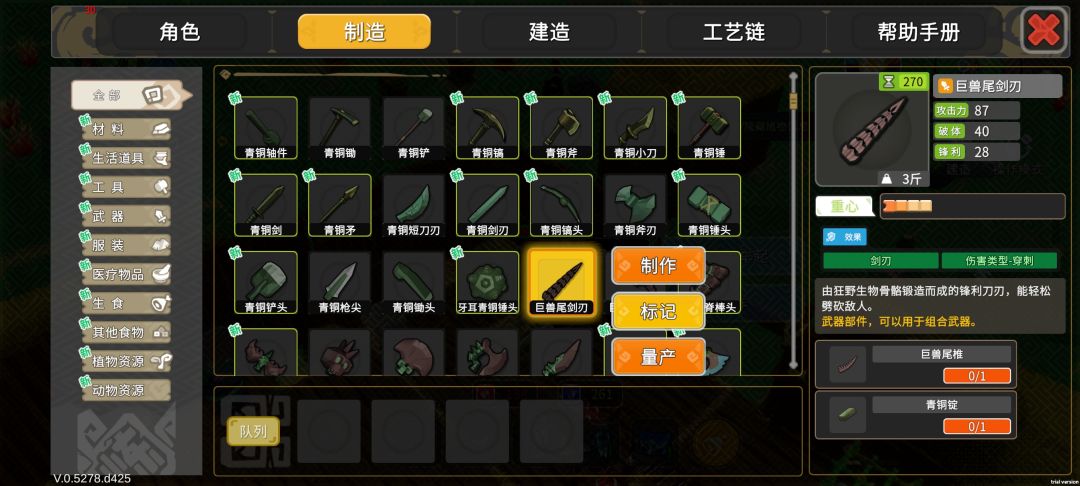 巨兽长枪:巨兽尾剑刃+长柄(青铜最好,前期没有用竹子和铜也可以)