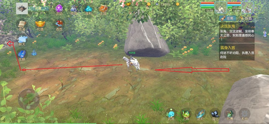 传送点的张角很厉害,咱跳过他,沿左边小路往前走,绕过石头继续走,看到木桥直接右拐穿过树林,来到后院偷袭张角,轻松完成剧情任务!