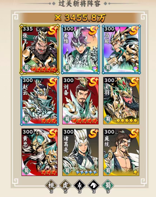 五虎+桃园+三劫,三劫做为现在的版本终点,获取难度较大,实测战力不俗,只可惜太吃资源