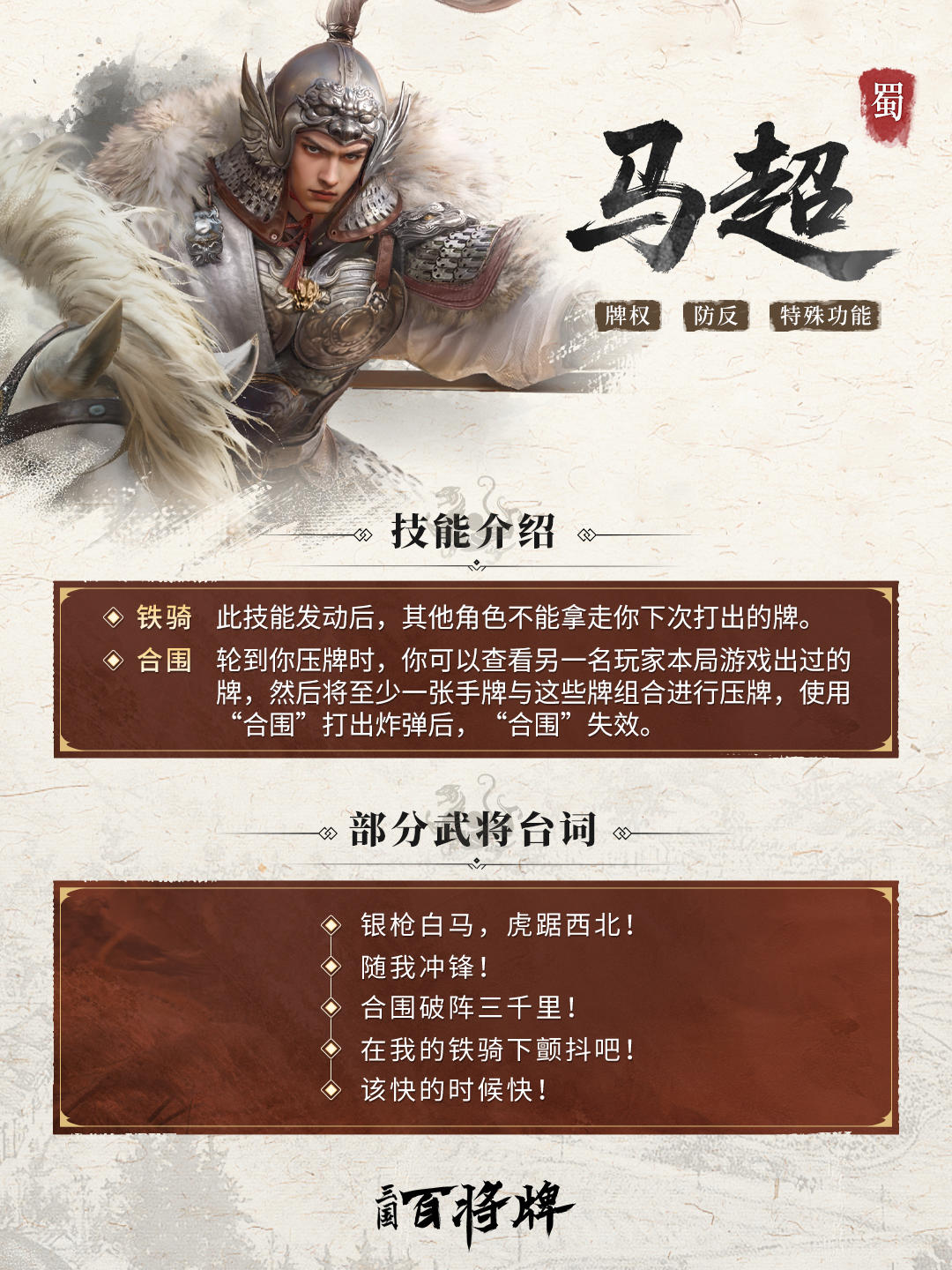 ◆技能简介:马超骁勇善战,凭一杆银枪杀得曹操割须弃袍,其神威在《三国:百将牌》中化作“铁骑”与“合围”双技。