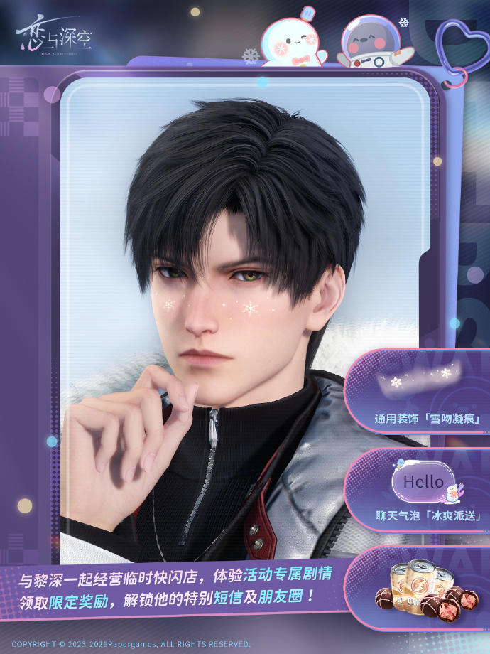 参与活动,体验专属剧情,免费获取通用装饰「雪吻凝痕」、聊天气泡「冰爽派送」、黑电能量·重磅和快乐巧克力,还可解锁黎深的特别短信及朋友圈!