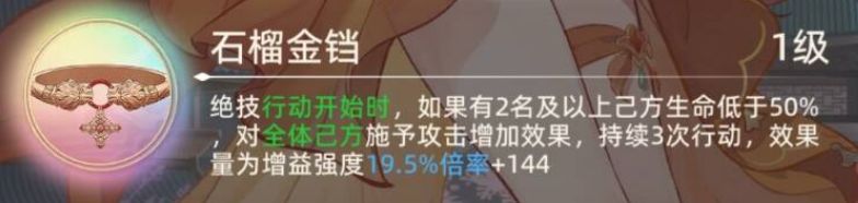法宝技能(1级):绝技行动开始时,如果有2名及以上已方生命低于50%,对全体已方施予攻击增加效果,持续3次行动,效果量为增益强度19.5%倍率+144。