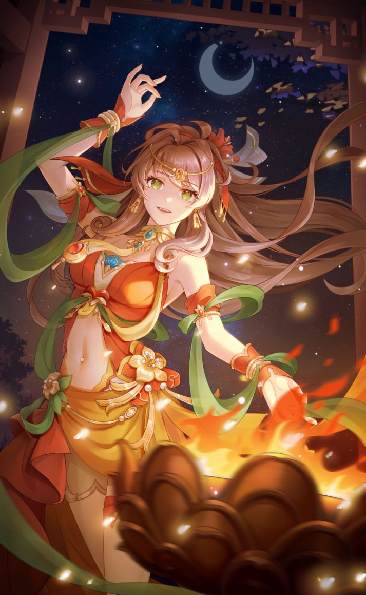 每当圣火大典开启,你就能看见那位失踪多日的奉火女准时出现在圣火旁,火花随舞步流转璀璨夺目,仿佛照亮了整座城池,令万物熠熠生辉……