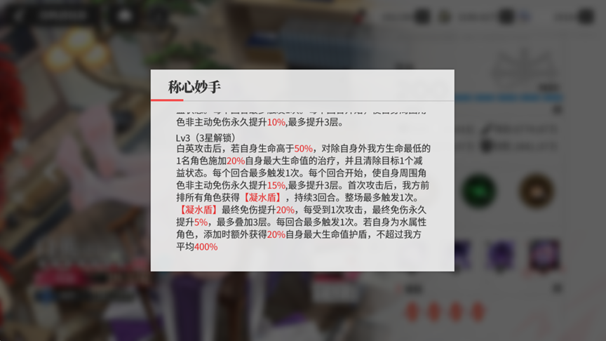 ②减伤:每个回合开始,使自身周围角色非主动免伤(针对Dot类固定持续伤害技能等)永久提升15%,最多提升45%。开局第一回合结束后,我方前排所有角色获得【凝水盾】,持续3回合。整场最多触发1次。