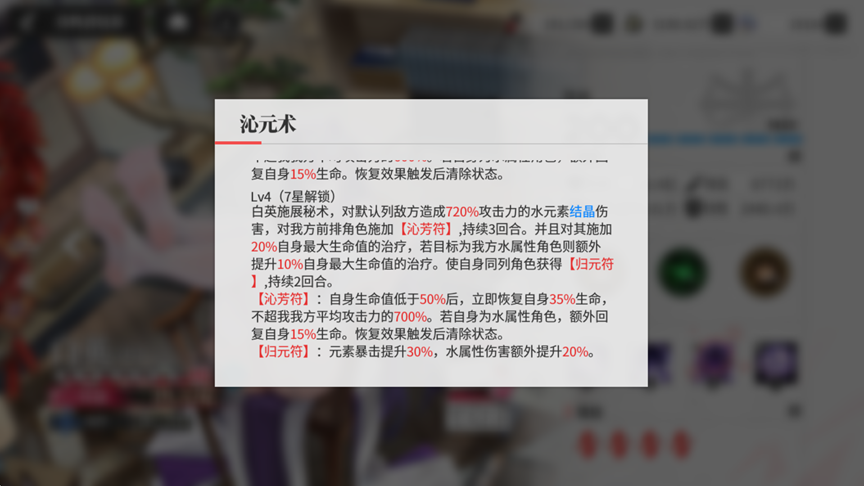 【沁芳符】:自身生命值低于50%后,立即恢复自身35%生命,不超过我方平均攻击力的700%。若自身为水属性角色,额外回复自身15%生命。效果触发后移除本状态。