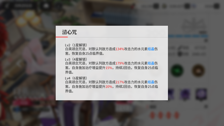 【凝露符】:角色行动后,获得自身20%最大生命值治疗,不超过我方平均攻击力的400%。并且提升自身受到治疗值10%,最多提升20%。同上联动锚点技能。