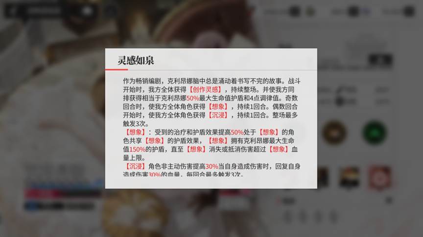 克利昂娜(UR 防御核心)的【创作灵感】(开局 60% 伤害减免,逐步衰减至 20%)覆盖全队前中期承伤,奇数回合的【想象】(治疗 / 护盾效果提升 50%)能联动白英的高额治疗能力强化队伍续航。