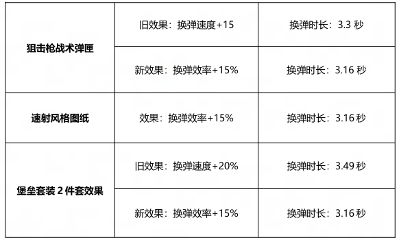 下表分别装备弹匣、速射风格图纸和防具套装效果后对应的换弹时长变化: