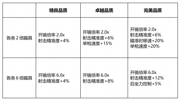 3、统一同类型配件的加成效果(如:精良品质的2倍瞄具,其加成效果均为开镜倍率2.0x、射击精准度+4%)。