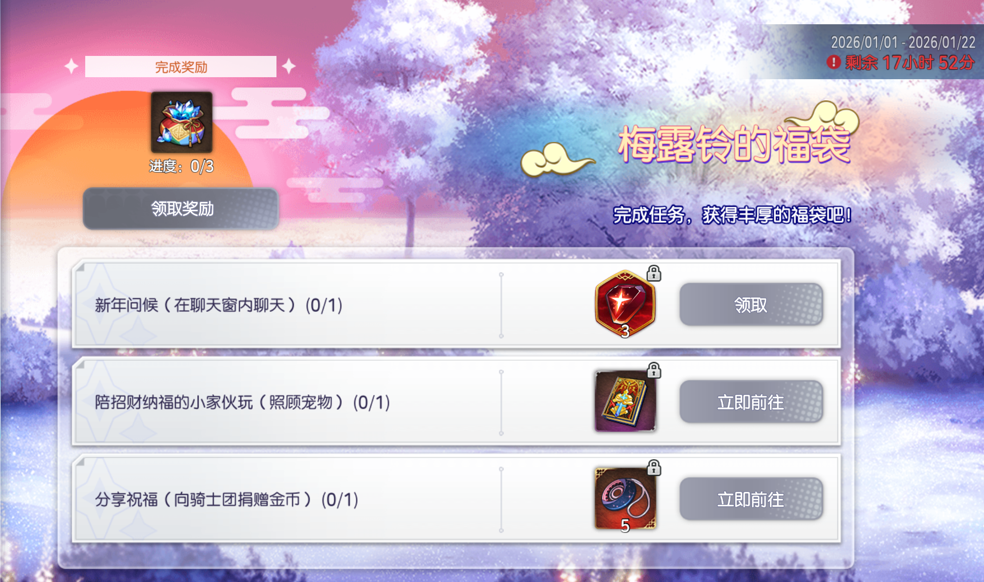 完成相关任务,可领取梅露铃的福袋,包括传说神器强化石、4-5星英雄召唤券、银河书签。完成全部任务,可领取天空石福袋。