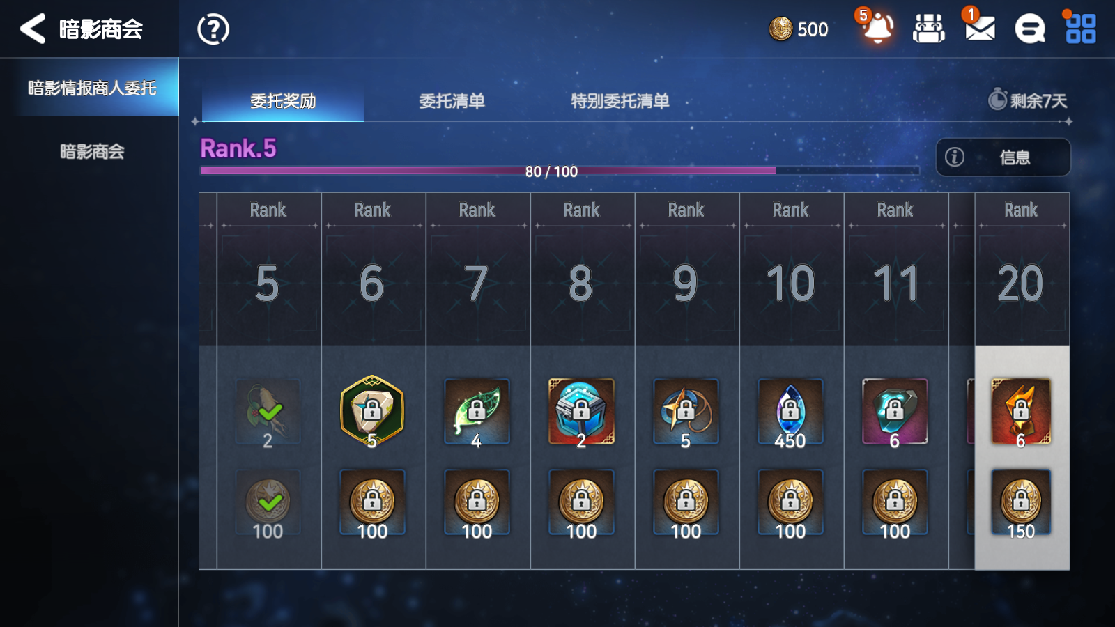 可通过进行赛季战斗副本,执行暗影商会所提供的委托任务。通过完成委托时获得的【暗影信物】,可获得委托奖励Rank经验值,每达成各Rank时,即可获得对应Rank的奖励。