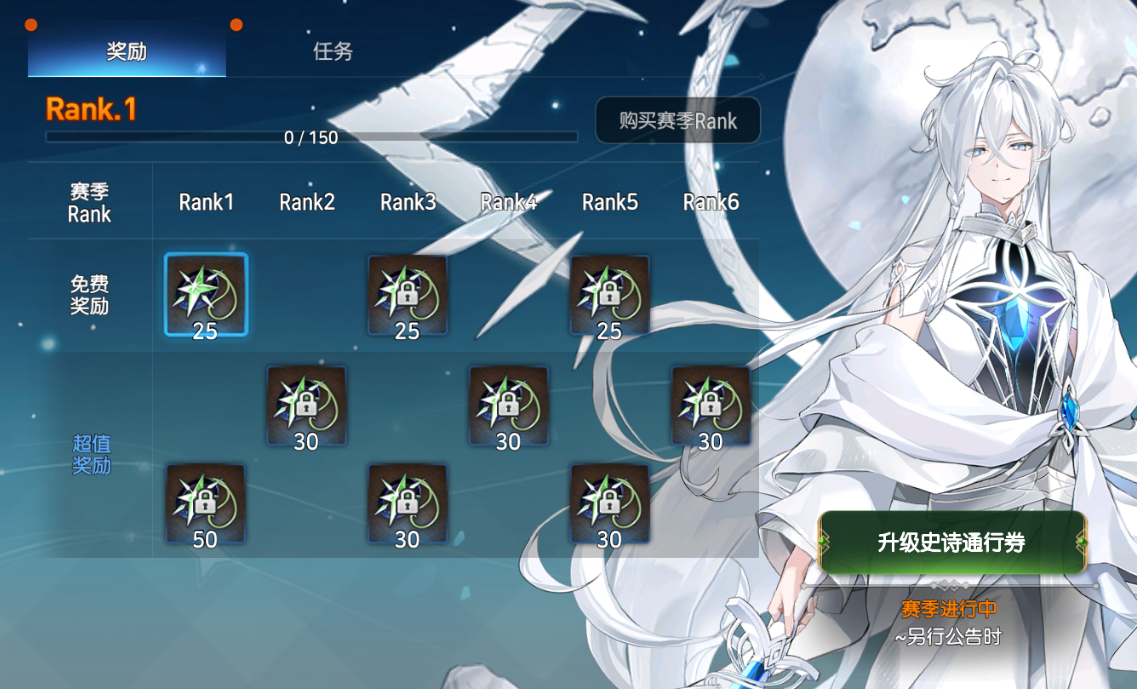 通过完成任务,可以获得赛季Rank经验,达到一定等级,可领取对应等级下的免费奖励,继承者也可以通过升级史诗通行券,获得更多超值奖励。