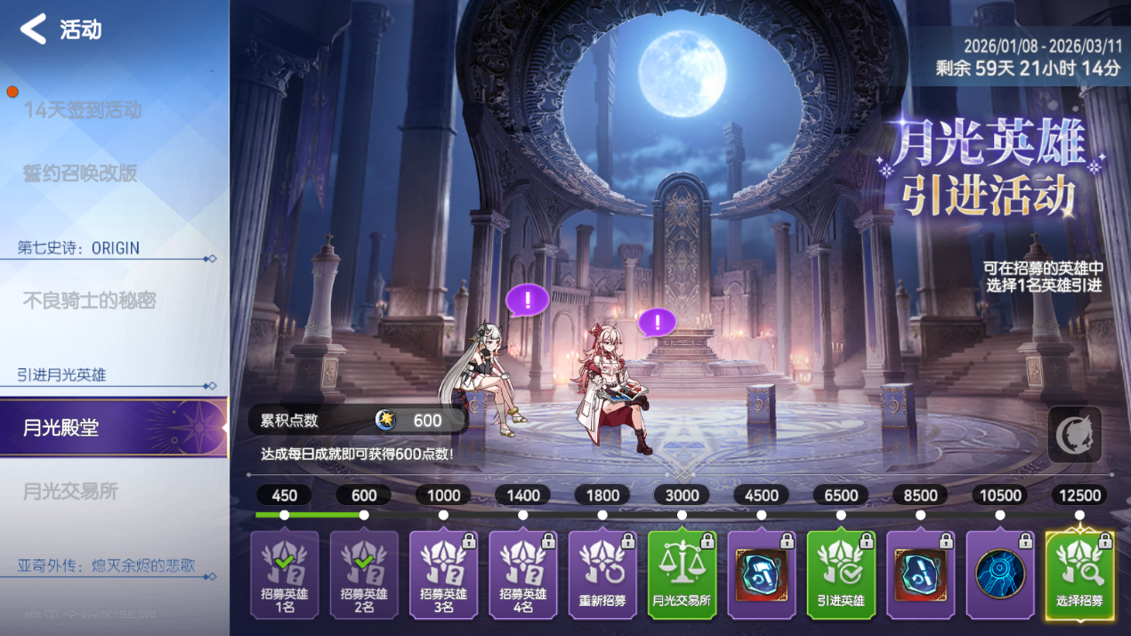 活动期间,继承者通过达成每日成就,即可获得点数,累积到对应点数时,开启相应功能,最终可在已招募的英雄中选择1名月光英雄引进。