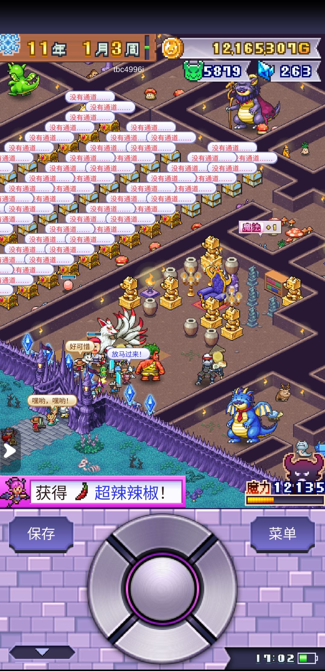 整理完思路,我们可以进行以下操作。根据你的刷怪速度调整道路距离,缺钱就放被褥(实际上很少出现这种情况)道路通向魔王和高属性怪物的房间,路口要很小,可以减少漏怪。道路的尽头是放宝箱的房间,可以利用堵路开路增加危险值,怕漏怪也可以直接堵路。中途增加危险值可以一直探险冒险者副本和魔王策略实施怪物增加。在每年结算的时候把路打开领蛋糕就行。结算时间是每年12月4周11格(周的右边有个进度条,总共17格,在11格的时候结算,大概4周1格就可以打开,相信自己的手速可以7格8格再打开)