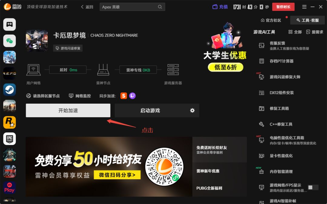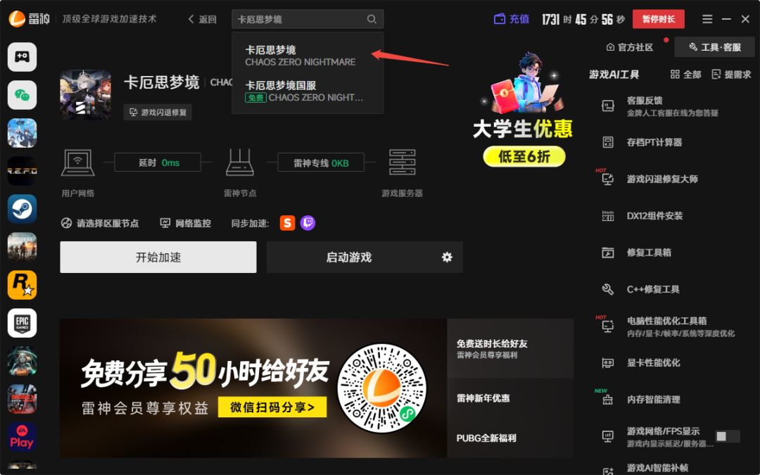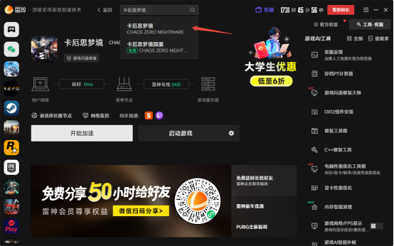 1. 使用雷神加速器加速“卡厄思梦境”。