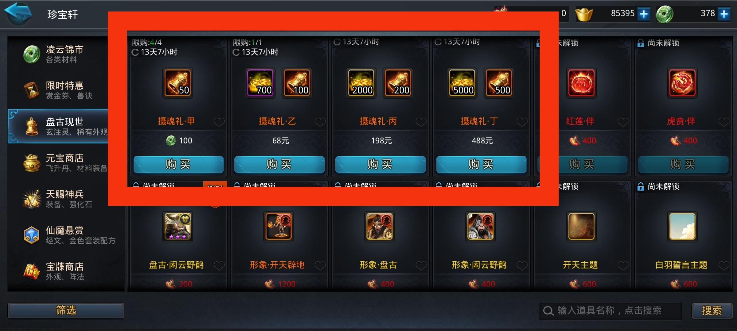 - 微氪玩家建议在购买4次摄魂礼·甲礼包(共400凌云壁)的基础上可依据个人实际情况,酌情选购摄魂礼·乙礼包(68元)或摄魂礼·丙礼包(198元),这样既省了钱,也加快了获取盘古的进度;
