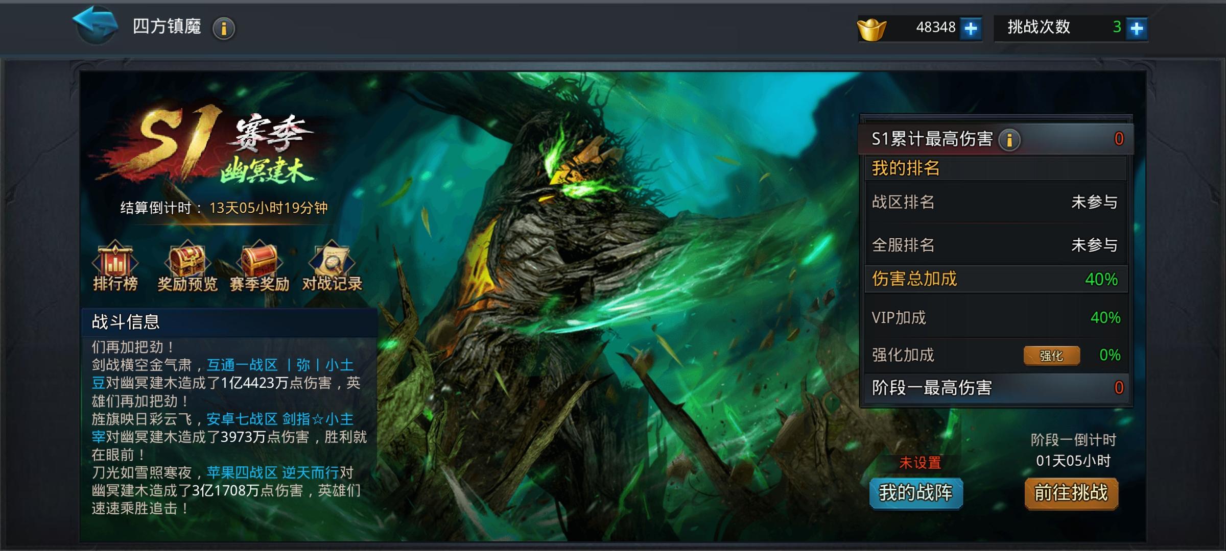 玩家等级达到92级后可通过奇遇—四方镇魔或长安城—演武台—幽冥建木处进入,需自己设置好3个队伍进行挑战,可消耗特定材料进行强化。和往期的那个猪八戒和玄冥应龙限时活动类似,只不过现在加了赛季并且进了奇遇,应该变成常驻活动了。