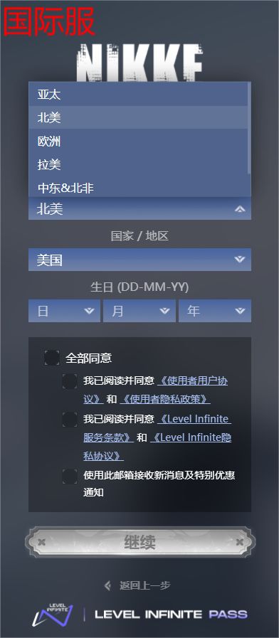 8.“国际服”需要选择地区,“港澳台服”直接同意即可。