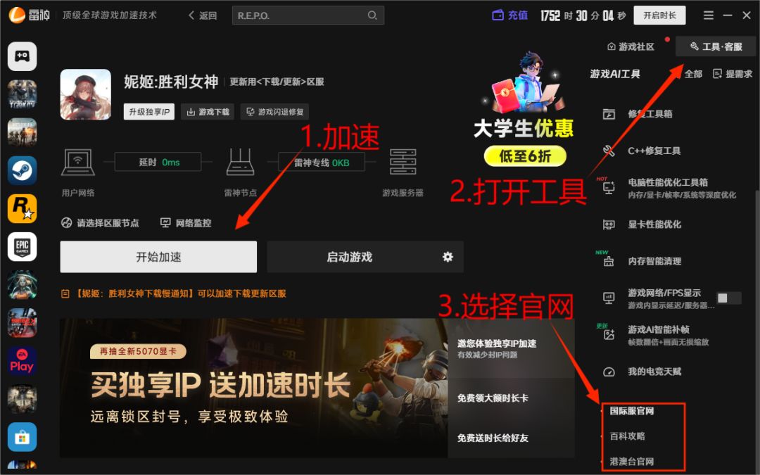 2. 点击“开始加速”加速游戏,打开国际服/港澳台官网。