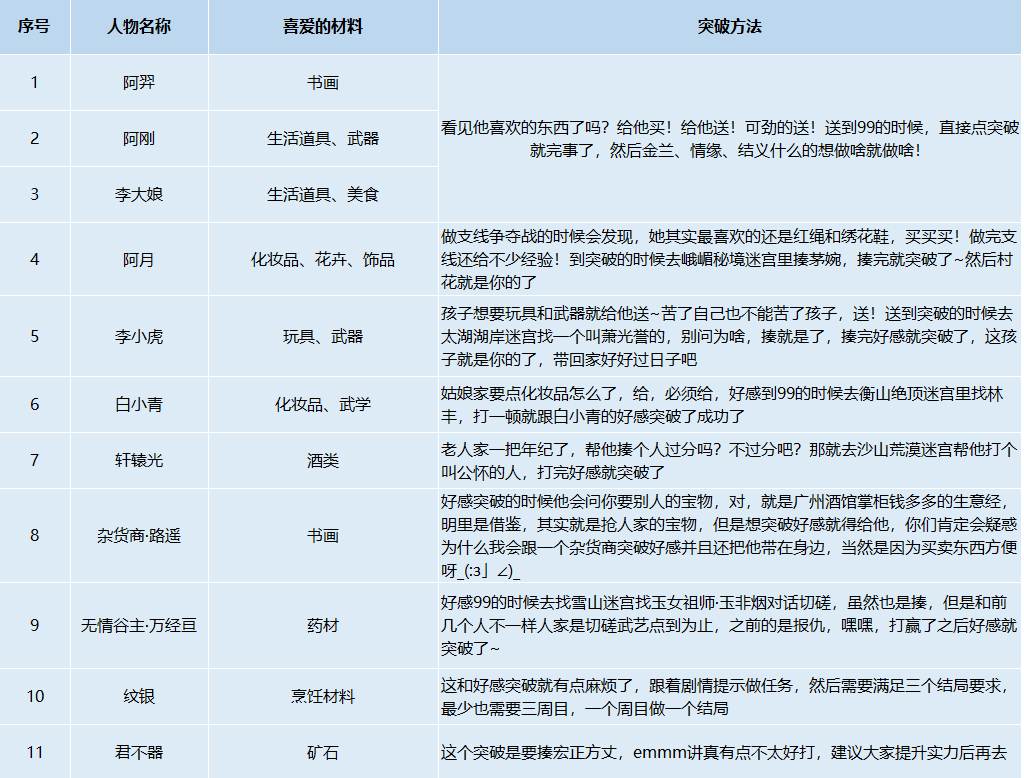 讲真侠客我也是接触没多久,就总结了一些我接触到的人物好感突破任务给大家分享一下,后续如果大家有想知道其他的人物好感突破攻略,可以在下面留言告诉我,我都会为大家整理后分享~