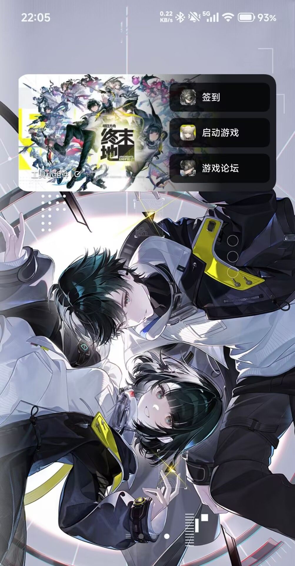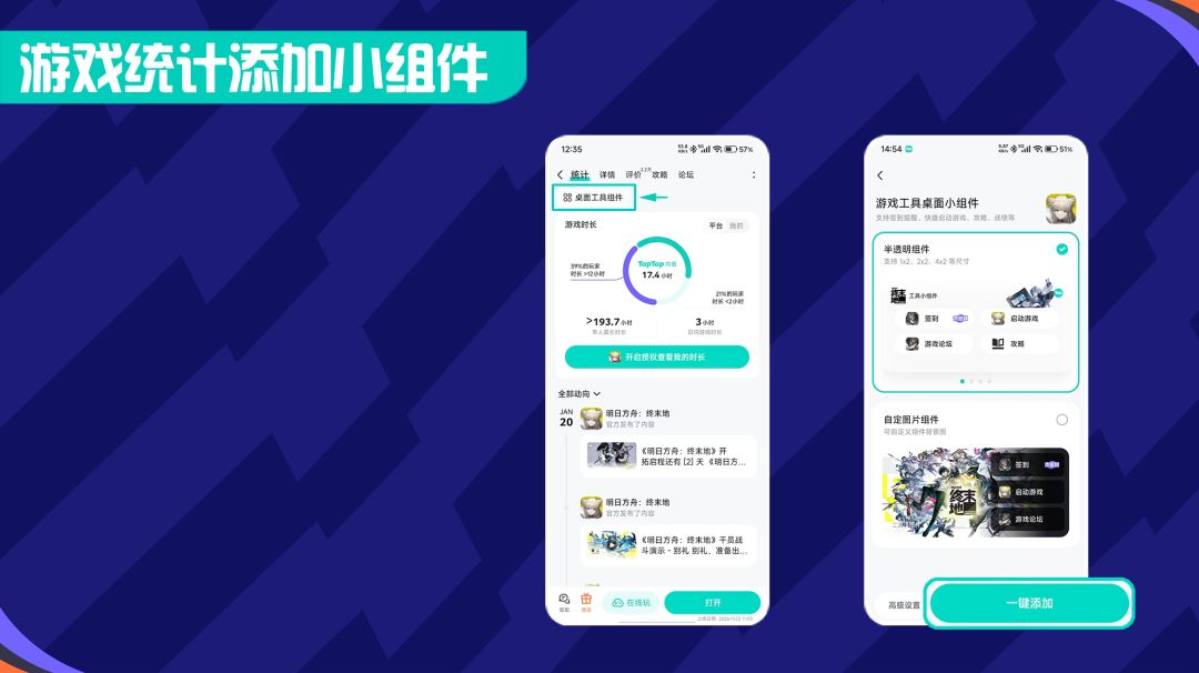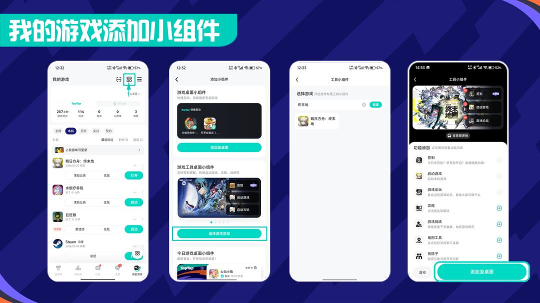 「我的游戏」页面右上角添加小组件,选择并搜索游戏「明日方舟:终末地」,更换背景图,选择功能后添加至桌面。