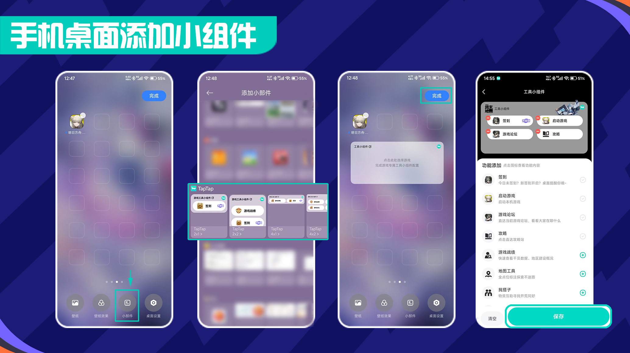 长按屏幕后点击小部件,搜索或找到Taptap游戏工具小组件,选择大小后添加至桌面,点击添加的小组件搜索游戏「明日方舟:终末地」,选择功能后保存。
