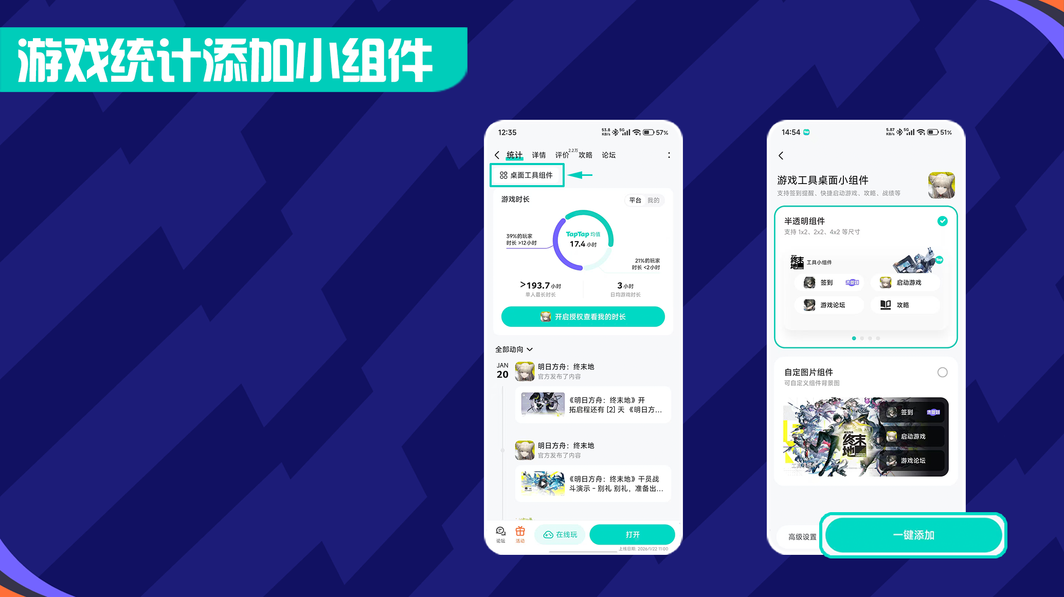 搜索框搜索游戏「明日方舟:终末地」,点击左上角「统计」,选择桌面工具组件,点选自定图片组件,更换背景图,选择功能后一键添加。