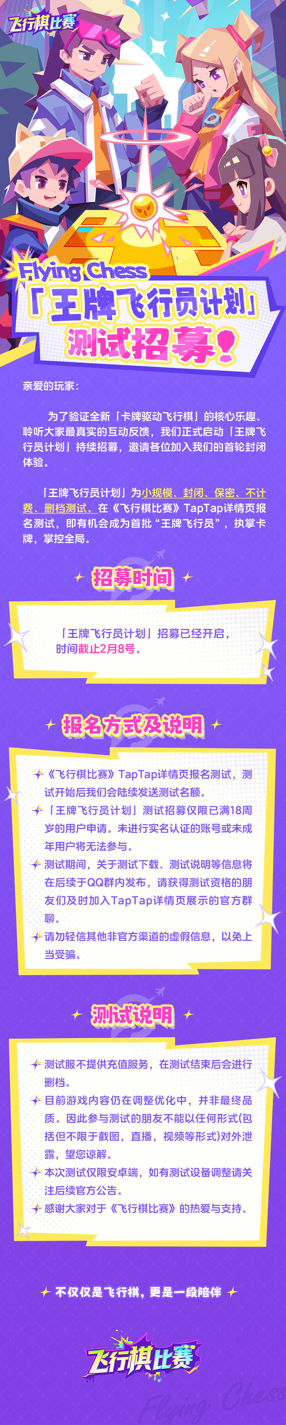 为了验证全新「卡牌驱动飞行棋」的核心乐趣、聆听大家最真实的互动反馈,我们正式启动「王牌飞行员计划」持续招募,邀请各位加入我们的首轮封闭体验。
