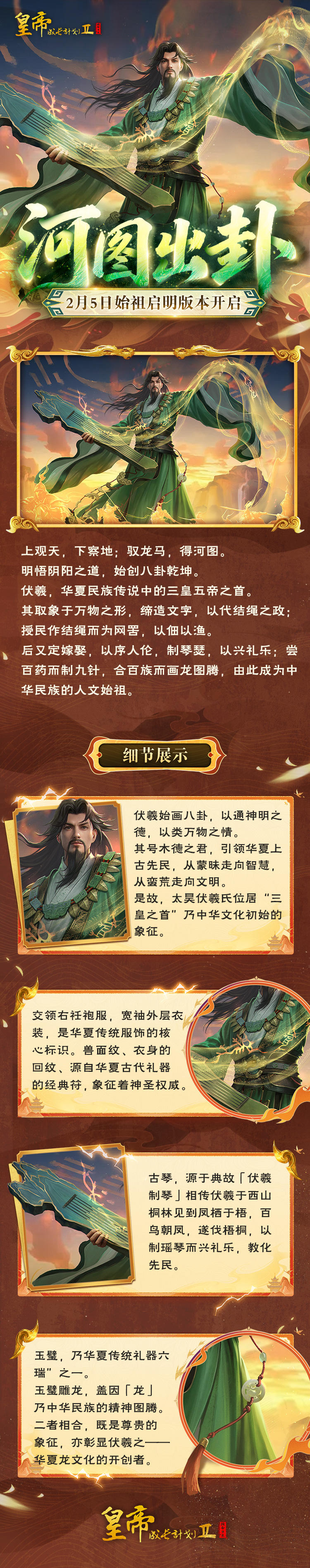 此皮肤将于2月5日随同【始祖启明】版本一同降临帝成。那么接下来还请大家一起观赏下【河图出卦】伏羲的英姿吧!