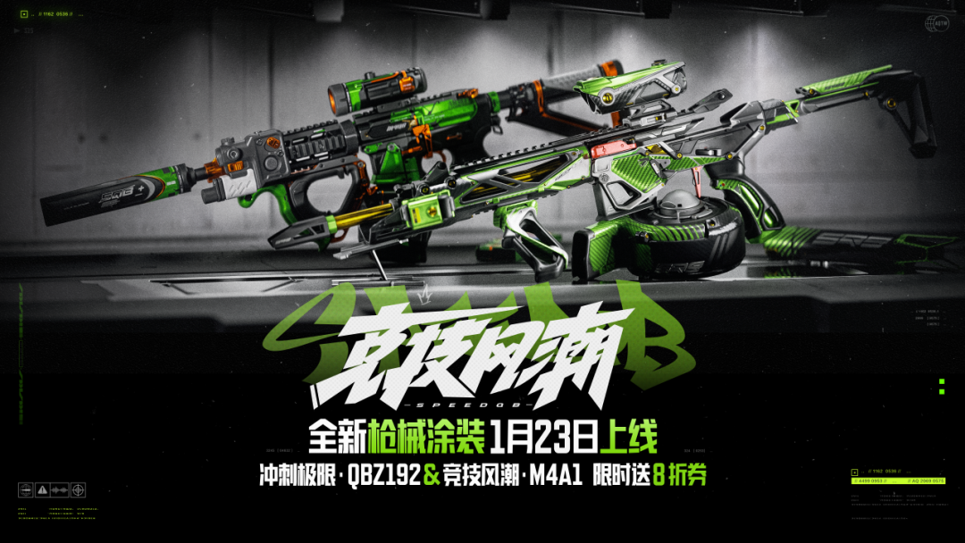 「竞技风潮」系列军需上新!全新橙色品质枪械涂装【冲刺极限·QBZ192】、金色品质枪械涂装【竞技风潮·M4A1】1月23日即将上线!当日登录还可限时领取8折优惠券!