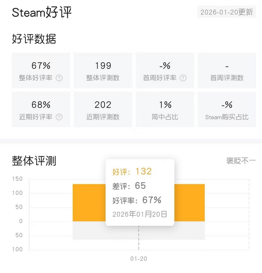 翻车类似,此次游戏在steam上线后的开局同样不是很顺利,评价很快变成了“褒贬不一”,好评率只有67%左右