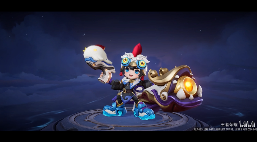 设计上以蓝白为主色调,点缀金红元素提亮,融入国风小鸡元素,凸显鲁班七号顽皮活泼的个性。头戴造型独特的小鸡头盔,身穿饰有金色线条的中式劲装,身后圆滚滚的小鸡背包搭配国风绳结,手持毛茸茸的小鸡手炮,炮身勾勒精致金色云纹,细节质感拉满。