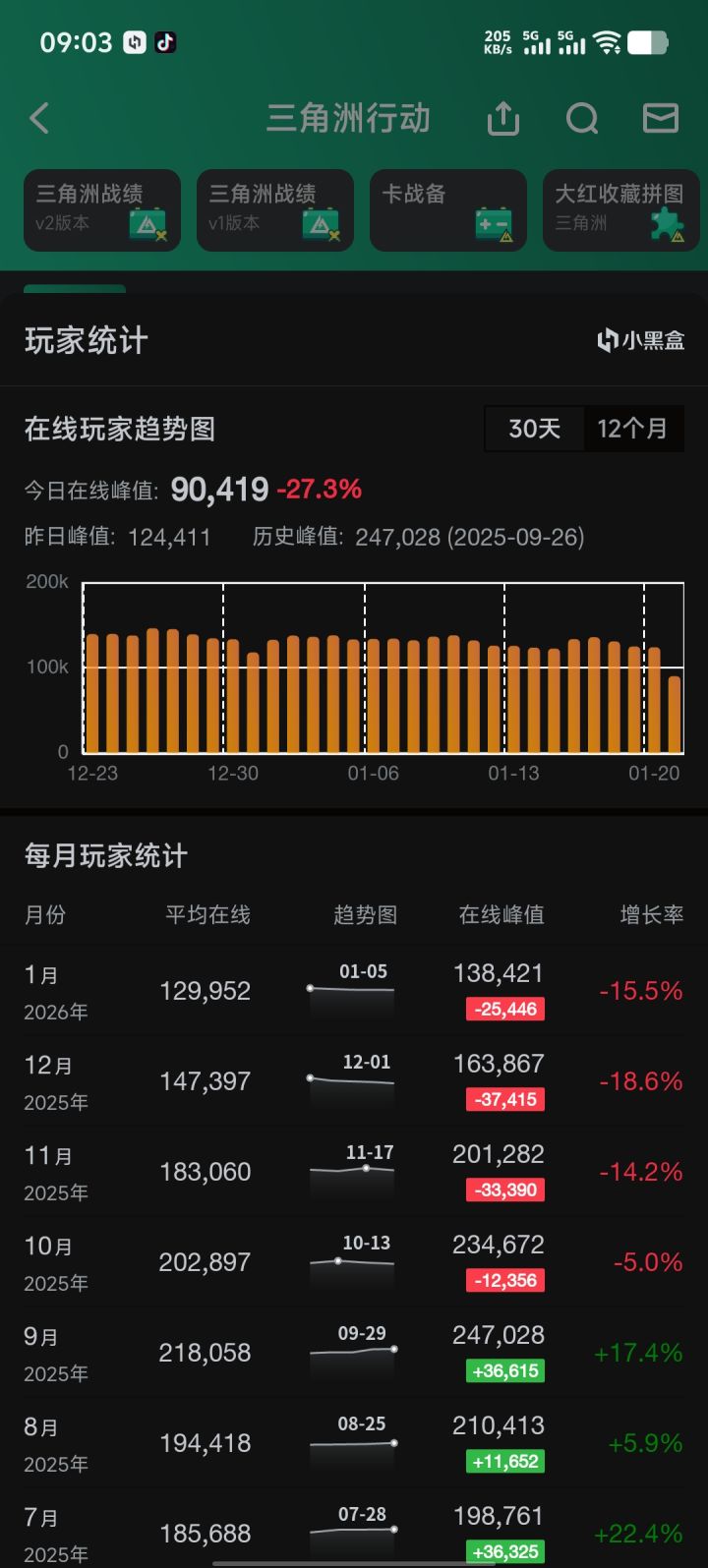 根据第三方平台上的玩家统计数据显示,三角洲的玩家热度似乎进入了一个降温期,曲线从2025年9月达到历史峰值后,各项数据就像坐了滑梯。平均在线人数从9月的21.8万,一路跌到今年1月的约13万。这个数据让不少关注这款游戏的人有点额,相关情况引发玩家热议。