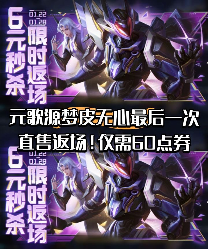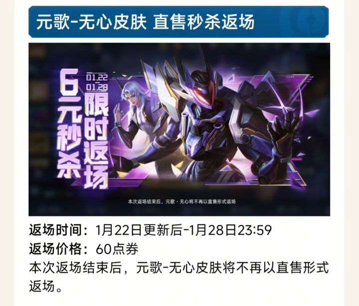 1月21日,王者荣耀官方正式宣布,元歌的源梦皮肤「无心」将于2026年1月22日迎来最后一次直售返场,这款备受期待的史诗品质皮肤将以60点券的亲民价格上架,返场时间持续至1月28日,此次返场结束后,「无心」皮肤将不再通过直接购买方式提供,未来获取途径可能转为抽奖形式,获取成本将大幅提高![[TapTap表情|TapFamilyxdoro2_粉狗比心]](https://img-tc.tapimg.com/market/images/101c7e3200596fe8e03765080b467fb8.gif)