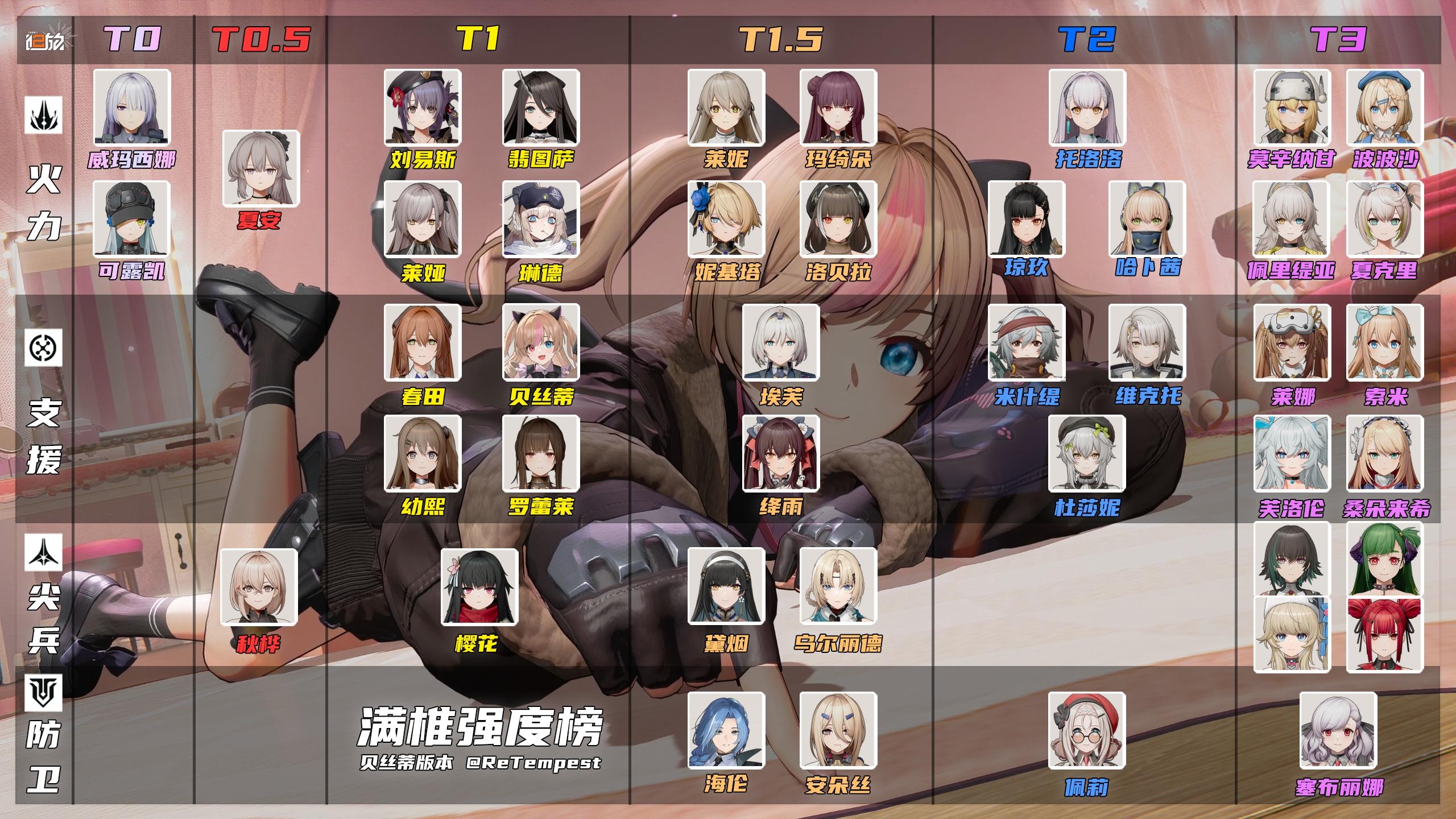 这次也对强度榜进行了一定的优化,先看满椎强度榜,为夏安和秋桦单独开辟了一个T0.5档位,这个档位和T0角色的输出是一个级别,但是没有对群能力,故而T0.5。贝丝蒂也是排在了T1的位置,和罗蕾莱、幼熙等角色是一个级别。少前2是一个需要优先满椎输出角色的游戏,因为辅助角色基本都是低椎完全体。角色的强度排行和队伍强度有很大的关联,例如电、冰队目前比较弱势,所以整体的排行都会偏低一点。