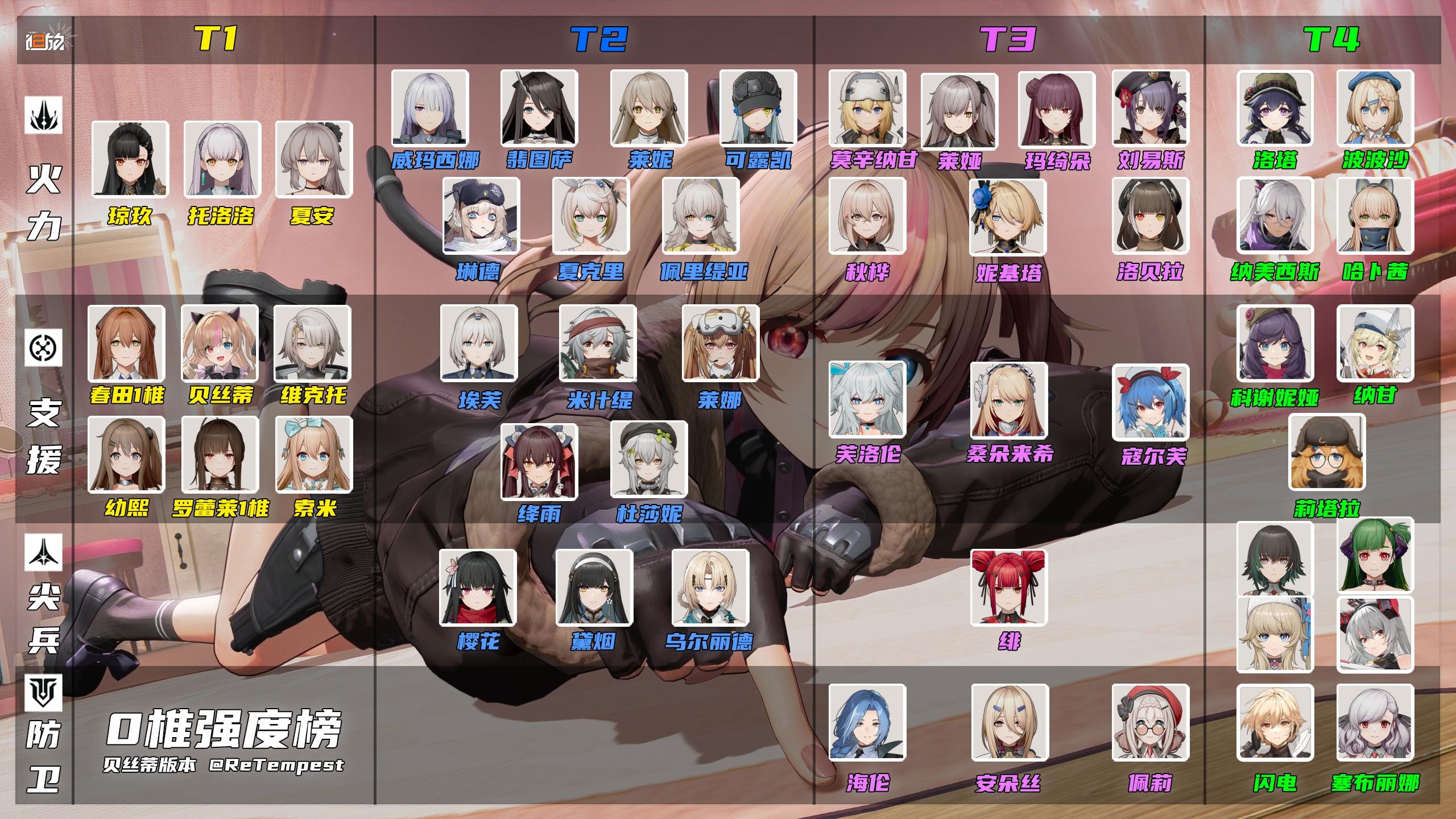 再看0椎强度榜也是同理,排在T1的基本都是辅助角色,毕竟很多辅助角色0椎就是完全体了。贝丝蒂作为最新的毒队辅助自然也是排到了T1。接下来就是全部可抽取角色的强度解析。