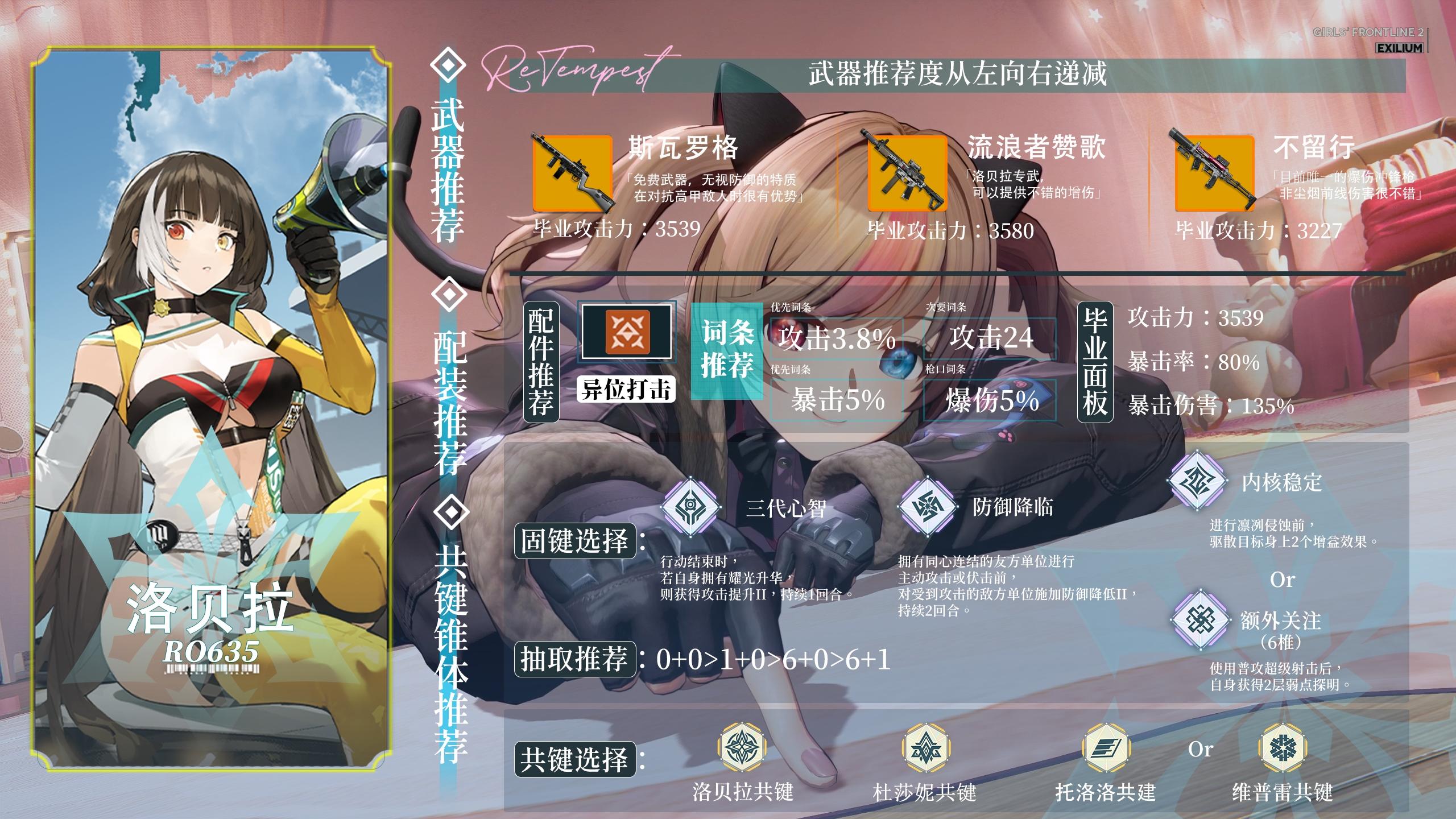 另一位复刻的洛贝拉;作为冰队的主c,但是因为是老角色,在羽中桩中满配冰队下的洛贝拉约为4000k伤害,新角色翡图萨在满配毒队中有6000k,这也是冰队目前不太强势的主要原因。仅推荐xp党抽取。