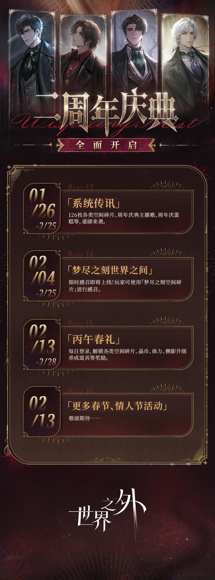 大的出现啦家人们!由网易游戏研发并运营,并被称之为六大“国乙”之一的无限流言情手游《世界之外》,它的二周年大庆它终于来啦!家
