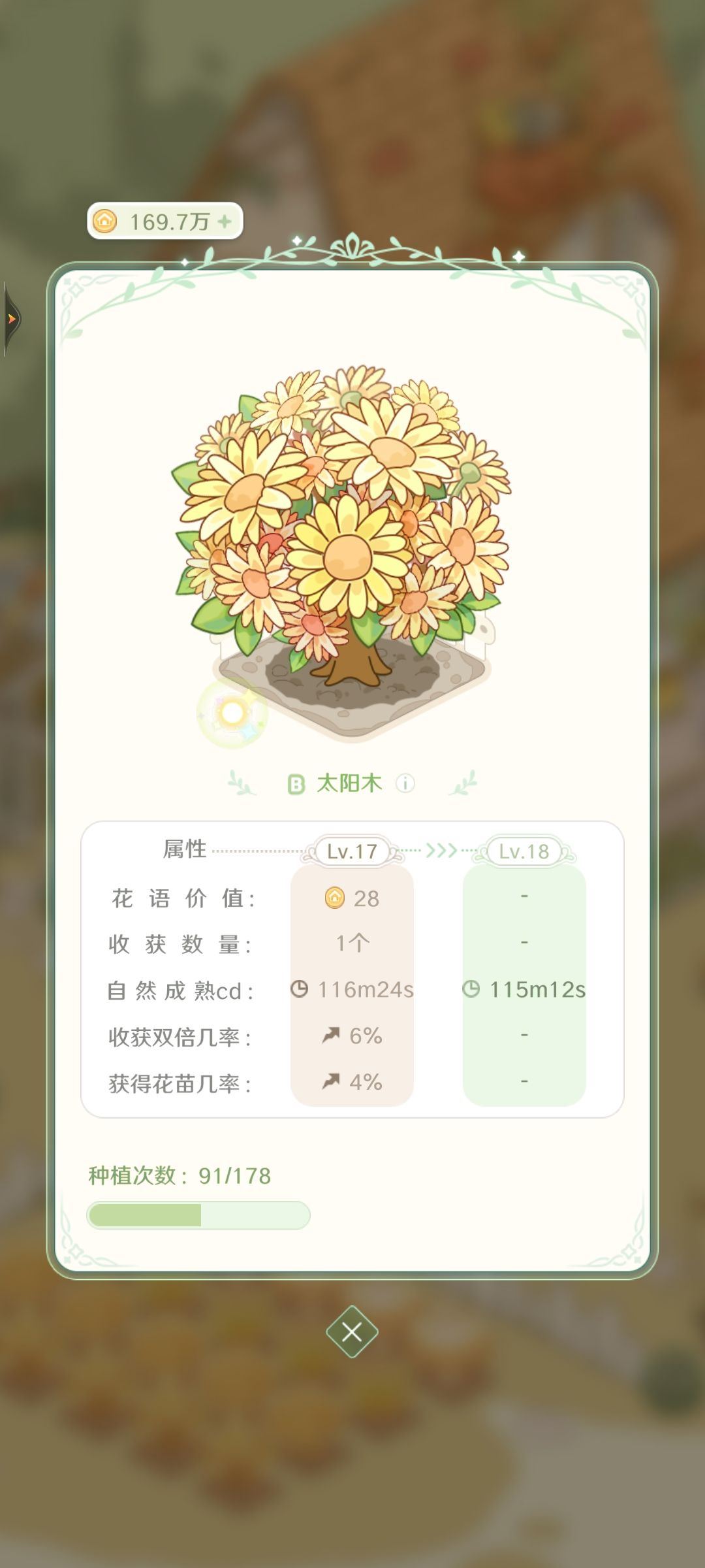 重点刷等级了,到了8-2的时候就开始卡关了。 新手日记都没完成,兑换300张设计图的任务难度有点大,没有月卡的加持要很久才能完成。 花语属性升级的价值感觉很低。 小物订单每次只有3个,还有没解锁的花语,拒绝了还有,等有时候想刷订单等cd也很麻烦。 好物的刷新还要币就很舍不得,有个任务要买萌鸭立,等到第三天才买到。 小人如果能有其他动作就好了,走来走去,浇浇花啥的,衣服因为太小了,颜色也接近,没什么兴趣。 在线礼包的时间真的太长了,每天都挂机3、4个小时挺有负担的。 同样花语2个小时收一次也很肝,如果能自动收花种花就好了。 画风什么的都很好,玩法可以再精进一些,期待下次( ﹡ˆoˆ﹡ )