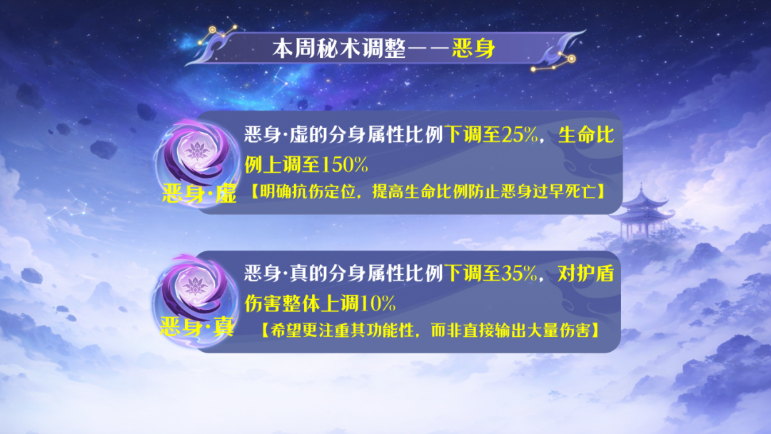 ● 恶身·真的分身属性比例下调至35%,对护盾伤害整体上调10%。