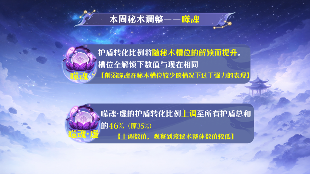 ● 噬魂·无,噬魂·虚,噬魂·真的护盾转化比例将随秘术槽位的解锁而提升。槽位全解锁下数值与现在相同。